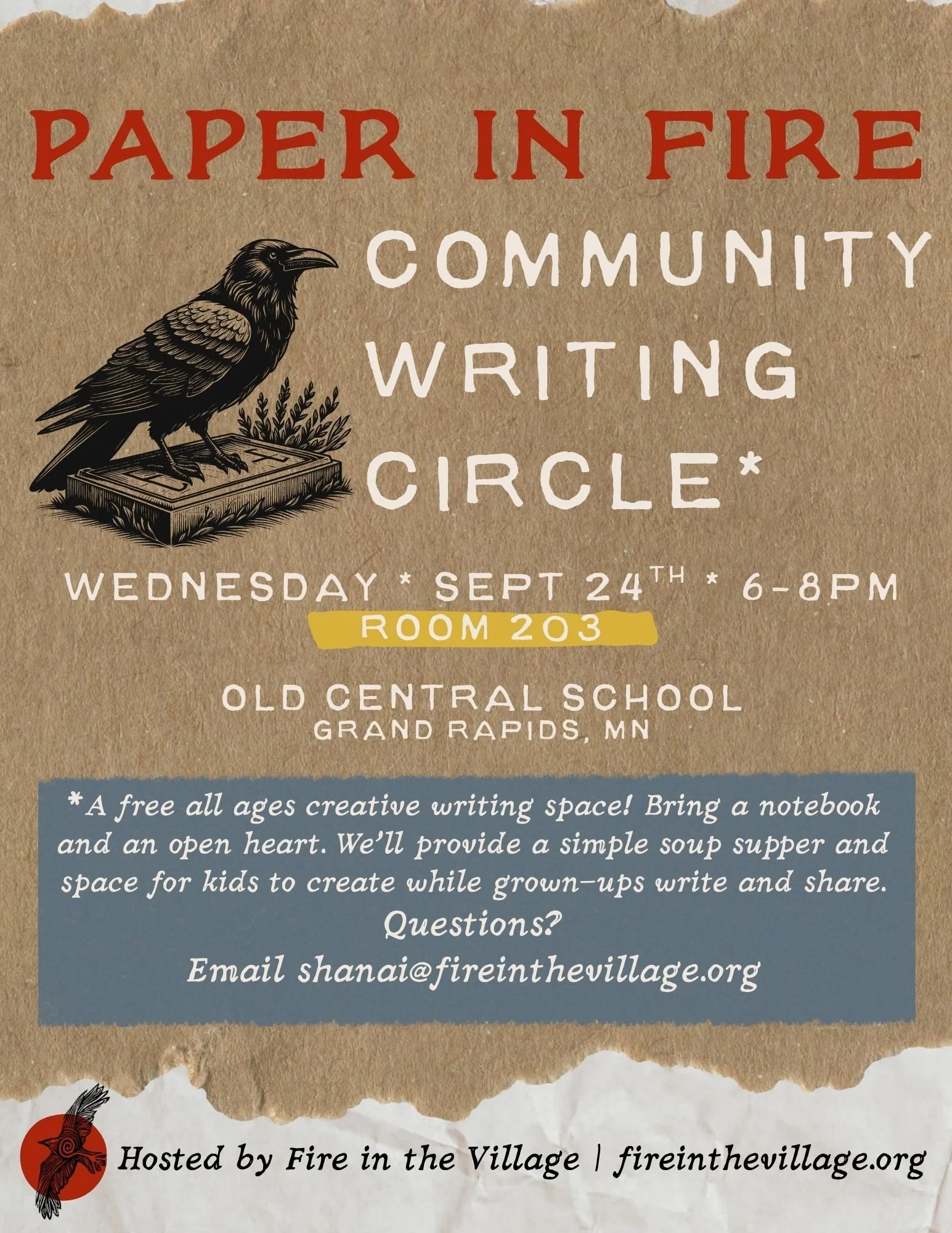 Gatherings happen in our new Fire in the Village home space in #203 on the second floor of Old Central School in downtown Grand Rapids, MN. All are welcome.