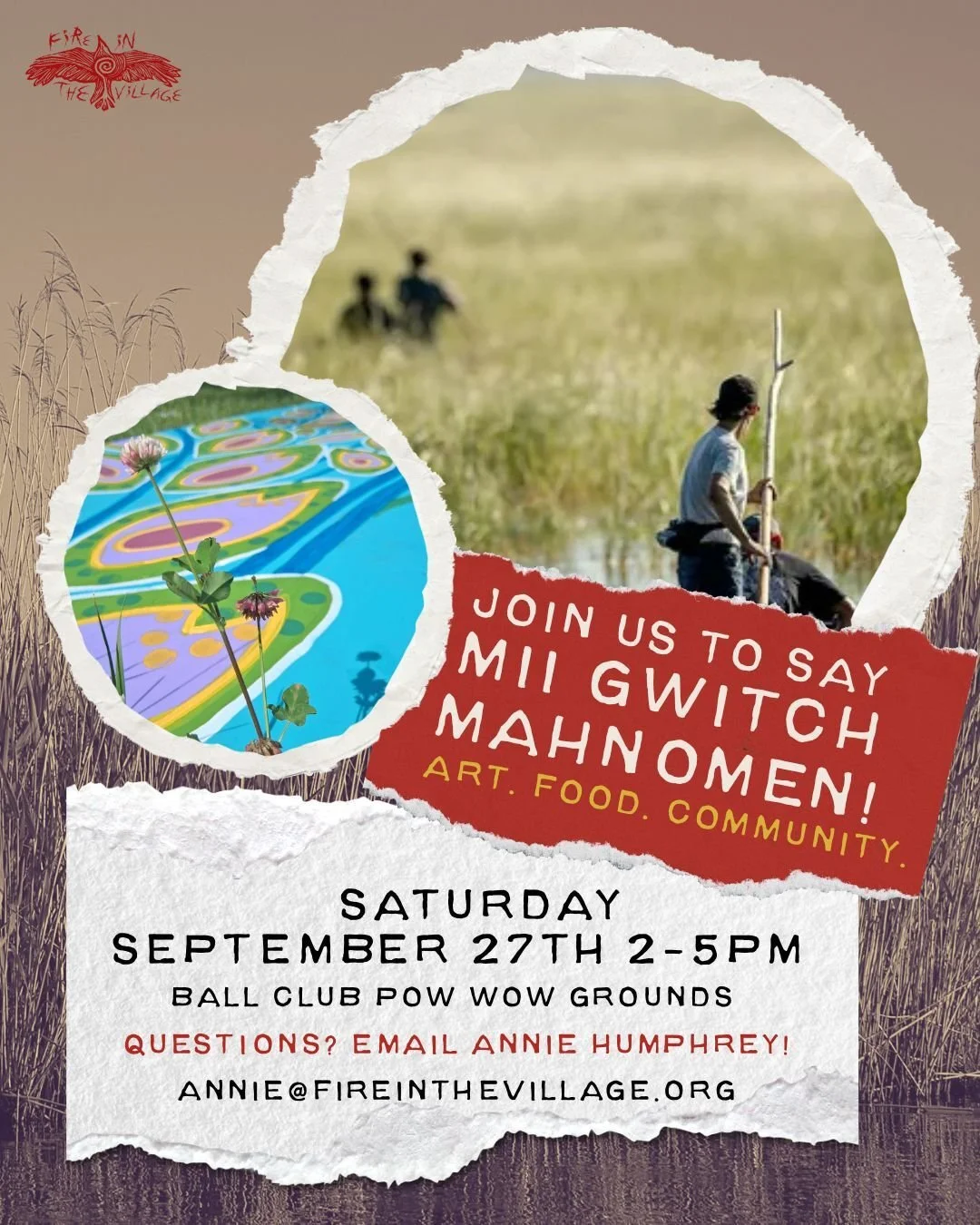The mahnomen was good to us this year. We are thankful for the resilience of our sacred food. We will recognize the youth who contributed to the creation and completion of the beautiful murals at the Pow wow grounds in Ball Club. Please motor on over to B.C. and have some food, visit friends, tell wild rice stories! If it is cold or raining, we will move the celebration to the Community Center next to the pow wow grounds.